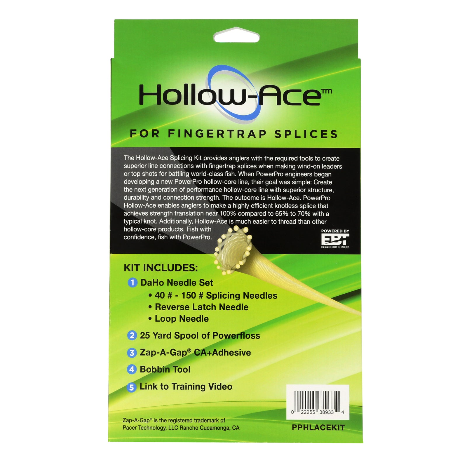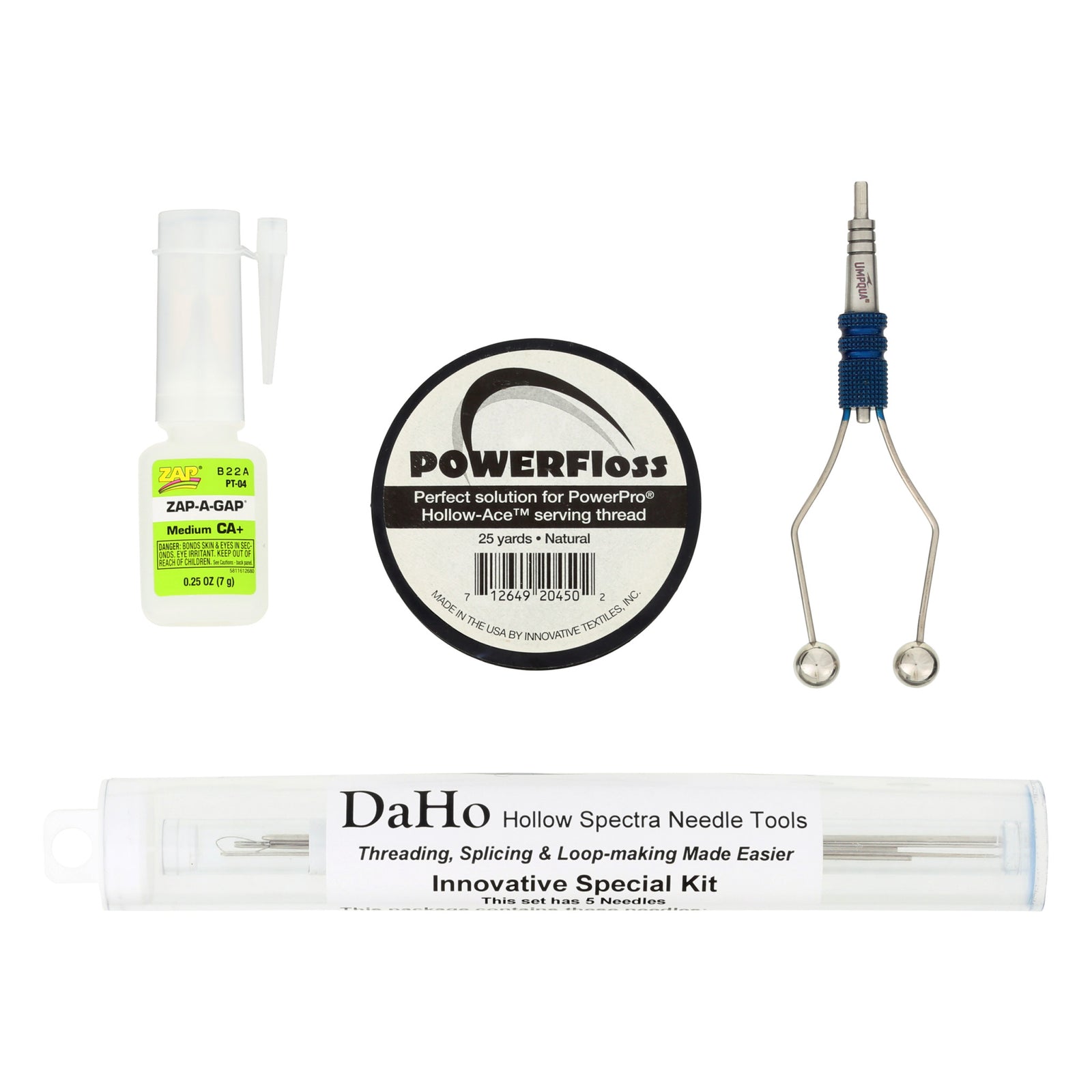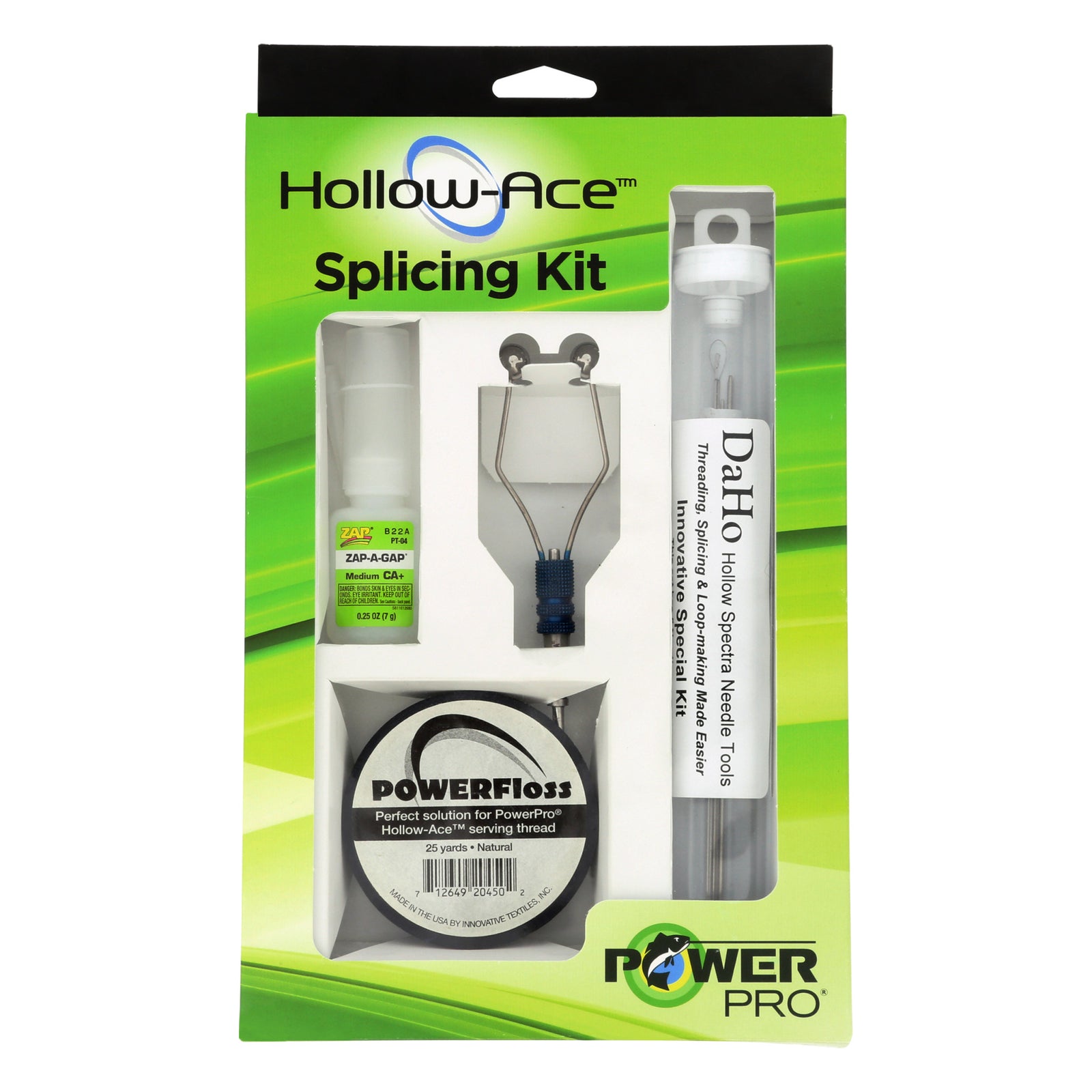 The PowerPro Hollow Ace Kit includes everything you need to create the perfect leader-to-line connection with PowerPro Hollow Ace for big-game fishing. The kit includes the following items: DaHo Hollow Spectra Needle Tools, Hollow Ace Big Line Add-On Needle Set, Powerfloss, Bobbin tool, and Zap-A-Gap glue.